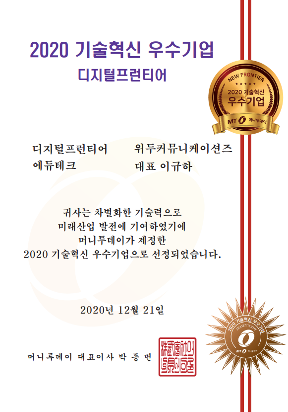 2020 기술혁신 우수기업 페이지 정보 작성자 WeDu 댓글 0건 조회 5,851회 작성일 21-12-31 12:58 본문 2020-12-21 2020 기술혁신 우수기업 디지털프런티어 에듀테크 머니투데이 대표이사 List Previous2020 소년한국 우수 어린이 도서 선정 21.12.31 Next2020 서울산업진흥원 2020 DMC어워드 21.12.31