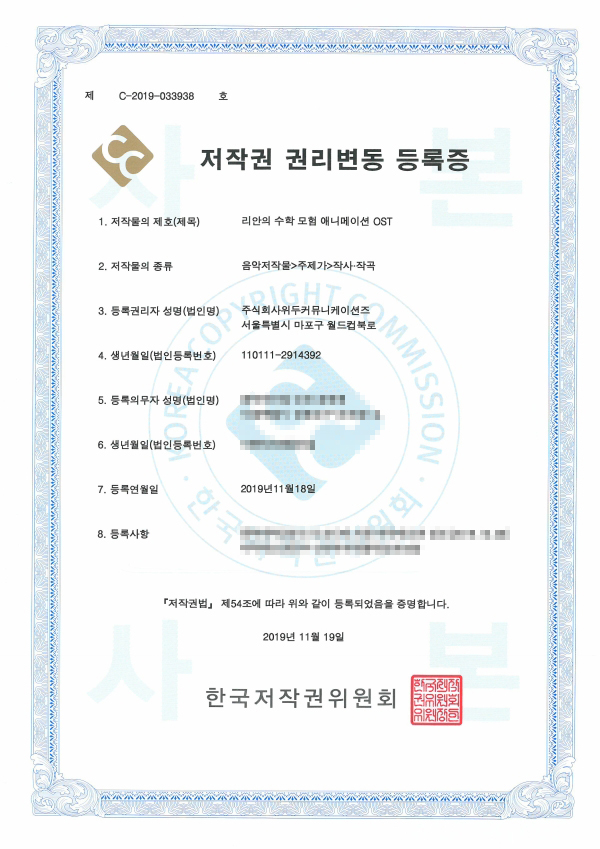 [한국/저작권] 리안의 수학 모험 애니메이션 OST 페이지 정보 작성자 WeDu 댓글 0건 조회 6,311회 작성일 19-11-25 13:54 본문 2019-11-18 저작권 C-2019-033938 음악저작물>주제가>작사·작곡 List Previous[한국/저작권] 리안의 수학 모험 여정의 시작 1,2,3,4,5 21.12.31 Next[한국/저작권] 애니메이션 리안의 수학 모험 19.11.25