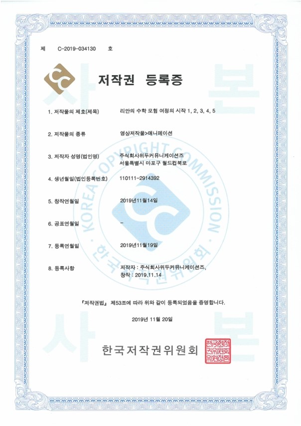 [한국/저작권] 리안의 수학 모험 여정의 시작 1,2,3,4,5 페이지 정보 작성자 WeDu 댓글 0건 조회 5,676회 작성일 21-12-31 12:36 본문 2019-11-20 저작권 C-2019-034130 영상저작물>애니메이션 List Previous[한국/저작권] OLL KIDS/MATH 21.12.31 Next[한국/저작권] 리안의 수학 모험 애니메이션 OST 19.11.25